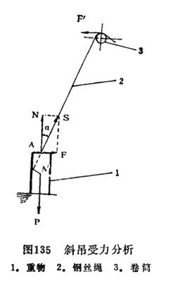 一个重物P公斤,放在地面上,如将其垂直起吊,则用相同的力量N或者比N稍大一些的力量,重物就可以离开地面。但是如用钢丝绳斜吊(拉力S与地面垂直线成一个α角),要想吊起重物来,钢丝绳的拉力S就要比重量P大很多才行,为什么呢?