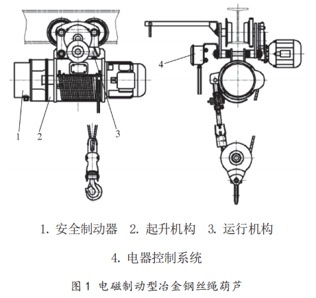 电磁制动或机械制动属于安全制动器的范畴,此类冶金电动葫芦类似于传统的CD、MD型钢丝绳电动葫芦,整机串联结构,包含起升机构、运行机构和电器控制系统。