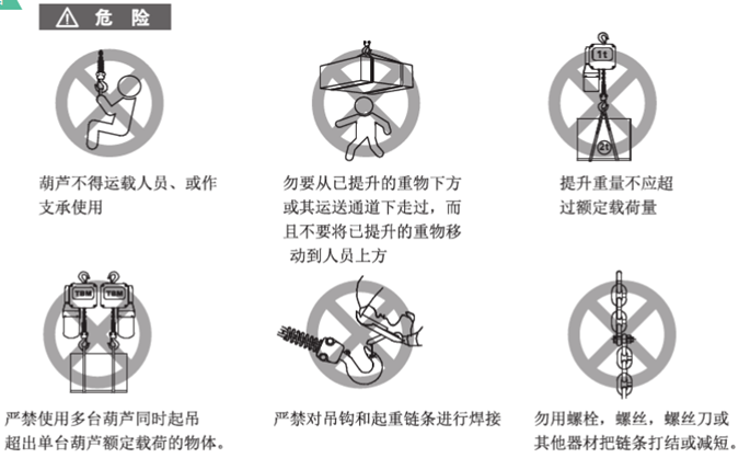 总则:不正确的使用或疏忽对于葫芦的维护,均可能导致危险状况的发生,例如:发生提升的负载降落不下来等危险状况。在安装、操作或维修之前,请仔细阅读并且遵守关于安全与操作说明的准则,以及所有的注释内容。