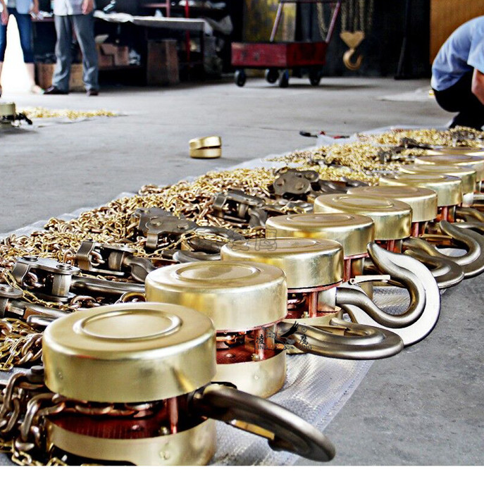 2、防爆手拉葫芦在起吊过程中,无论重物上升或下降,拽动手链条时,用力应均匀和缓,不要用力过猛,以免手链条跳动或卡环。操作者如发现手拉力大于正常拉力时,应立即停止使用。维护方法:使用完毕应将葫芦清理干净并涂上防锈油脂,存放在干燥地方。维护和检修应由较熟悉葫芦机构者进行,防止不懂本机性能原理者随意拆装。