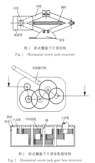 新型卧式螺旋千斤顶系统由电机、减速箱、上下举臂、固定板和底座组成,且可实现电动与手动的快速转换。电动时,电机可正反转动,通过1组外啮合圆柱齿轮减速后带动螺杆转动,可实现千斤顶的顶起、回落过程。手动时,可通过在齿轮箱定位孔上安装手柄,通过首要手柄架,带动螺杆转动,电动与手动的快速转换通过齿轮轴手柄装入和取出实现,结构简单,切换可靠。