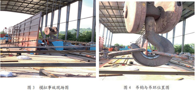 为还原事故真想,将吊钩防脱钩装置恢复到正常工作位置,在采取相应安全措施的前提下,现场模拟事发时的工作状态,如图3所示,重新用2副双肢环链索具悬挂被吊物,在索具张紧后缓慢提升被吊物,待被吊物一端离地后停止,进行 现场观察确认。由现场模拟状态可知: