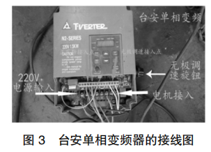应用台安接触器代替转子串电阻,通过编写变频调速程序,把传统星形接法改为三角形接法,实现线路改造,台安单相变频器的接线图如图 3 所示。