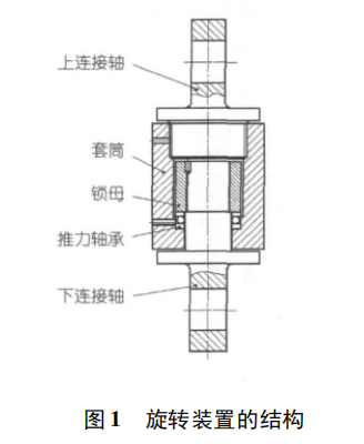 钢丝绳旋转装置的结构见图1,上连接轴1与套筒2通过螺纹连接,并用销钉锁死形成一体,与此类似下连接轴5穿入套筒内后,与套筒内的锁母3旋合并锁死,这样整个装置就分为上下两部分。这两部份通过中间的推力轴承4连接起来。该装置最大的特点在于,由于有推力轴承存在,上下两部份可以独立地转动,即在上连接轴发生旋转时,下连接轴保持不动,这正满足了解决钢丝绳“打麻花”问题的要求。