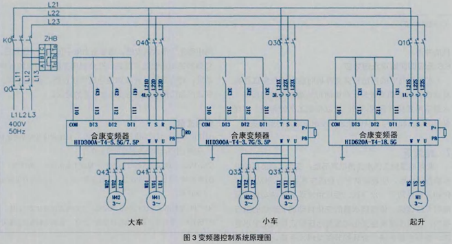 方便设定大车、小车运行速度:通过变频器改变电源频率进行变频控制,采用多段速控制方法对电动机的速度进行设定,提高运行定位的准确性,也可以进行点动操作。