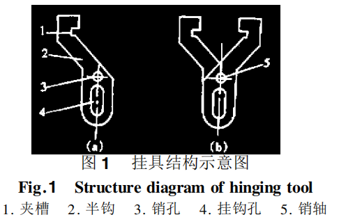 如图1所示,挂具的主体部分是1个尺寸形状完全相同的部件,这里称之为半钩。半钩上有夹槽、销孔和挂钩孔,如图1(a)所示,夹槽用来夹持工字钢顶梁或铰接顶梁的下缘,销孔中穿入销轴将半钩组装成挂具,如图1(b)所示。2个半钩绕销轴转动可改变2个夹槽之间的距离,实现摘下和按上挂具的动作。挂钩孔中插入手拉葫芦的挂钩,手拉葫芦的挂钩起到固定销的作用,限制2个半钩开合,实现挂具夹持牢固。