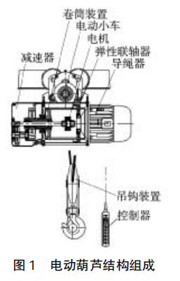 电动葫芦通常称为电葫芦,是一种常见的轻小型的起重设备。常见电动葫芦的控制方式有两种,一是使用按钮在地面跟随操作,二是在司机室内操控或采用无线远距离控制。电动葫芦一般由电机、传动机构和卷筒装置或链轮机构组成。电动葫芦可以分为钢丝绳电动葫芦和环链电动葫芦两种。钢丝绳电动葫芦可以分为钢丝绳电动葫芦和环链电动葫芦两种。钢丝绳电动葫芦又可以分为单速提升型、双速提升型、微型电动葫芦、卷扬机、多功能提升机等多种类型?;こСS玫绾⑿偷缍蛐酆?,往往在加料或维修车间频繁进行检维修作业的固定点位安装,设备拆装位置因综合考虑现场空间安全和建造成本往往不会安装电动葫芦,化工厂常用电动葫芦结构组成如图1所示。
