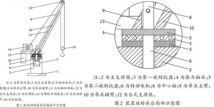 主支撑架的上部设有带转动电机安装槽,转动电机的输出端依次贯穿安装 槽的上侧壁、推力轴承和第一旋转托盘与带中心轴的 第二旋转托盘固定连接。中心轴上固定连接有包括吊具主臂和吊具辅臂的吊具臂,吊具主臂与中心轴通过螺栓固定连接,吊具主臂和吊具辅臂之间设有若干补强加劲板。吊具主臂的一侧设有上端带电动葫芦台式 支撑座和定滑轮,吊具辅臂的一侧设有滑轮吊钩装置,电动葫芦的钢丝绳端依次贯穿定滑轮和滑轮吊钩装置 后与吊具辅臂的上端固定连接,滑轮吊钩作用在待回收的轨道上通过电动葫芦和钢丝绳作用定滑轮,使得 滑轮吊钩对待回收轨道进行提吊拖拉,通过旋转电机能够驱动第二旋转托盘及与其相连接的吊具臂旋转,待回收轨道提拉旋转至合适位置后,将待回收轨道放置于轨道运输平车上,完成钢混桥梁的架桥机轨道回收。台式支撑座的下端设电控箱,通过电控箱对电动葫芦和转动电机进行控制,电控箱分别与电动葫芦和转动电机电性连接。电控箱的表面设有防腐涂层,通过防腐涂层能够让电控箱在施工现场的较差环境中具有更长的使用寿命。吊具台座的底部设有防滑垫,通过防滑垫能够让本装置在使用时更加稳定。吊具台座的内部设有重力块,通过重力块能够让本装置在使用时更加稳定。