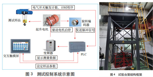 3)触发、制停距离检测。采用旋转编码器可实现触发距离与制停距离的测量。动态负载试验下,触发、制停距离过大,或者无法实现制动功能,表明棘轮棘爪型安全制动器可靠性无法满足要求。测试装置主要由钢结构试验台架、测试控制系统、辅助吊运装置、梯子平台等构成,见图4。该测试装置功能包括:1)对5t及以下单轨小车式及双梁小车式钢丝绳电动葫芦进行静态和动态试验(不含小车行走功能);2)测量、显示并记录空载变频调速下电动葫芦棘轮制动器的触发速度;3)测量、显示并记录负载坠落试验下电动葫芦棘轮制动器的触发速度、触发制停时间、触发后的制动下滑量。