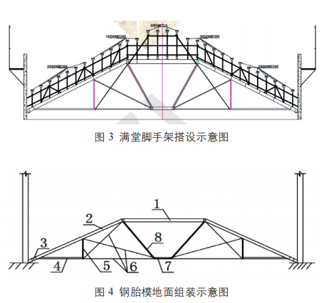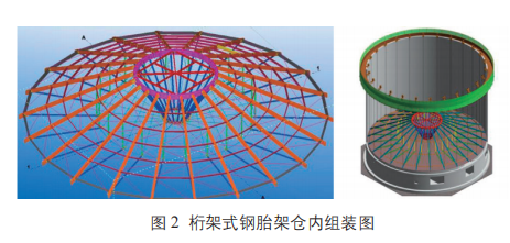 (2)钢桁架仓内地面组装。①将浅圆仓内地面回填并平整,便于地面组装钢胎模架。在仓内中心地坪上搭设长 6m× 宽 6m× 高 3m 的满堂钢管脚手架,在满堂钢管支撑架顶部满铺跳板组成上弦环梁安装操作平台。将上弦环梁在仓外平坦地面组装好后,用塔吊吊至仓底预先搭好的满堂钢管支撑架上,在吊装就位前按照预设的线将上弦环梁上螺栓孔对准筒仓壁牛腿预埋钢板的中心。此外,照设计要求搭设26榀钢桁架,用高强螺栓将 H 型钢桁架钢梁与上弦环梁连接成整体后,进行其他组件