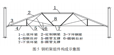 ③钢桁架零部件全部采用高强螺栓连接紧固,应注意以下几点 : 连接钢板的连接面应平整,螺母下方加垫弹簧垫片 ;安装时有倒角的一侧朝向螺栓头 ;现场安装时螺栓孔要较螺栓大一个等级,若螺丝孔较小,不得用气割进行扩孔,应采用铰刀或锉刀修整螺栓孔,连接施工用的扭矩扳手在使用前应进行校正,安装高强度螺栓初拧后再进行终拧直至拧紧为止(见图 5)。