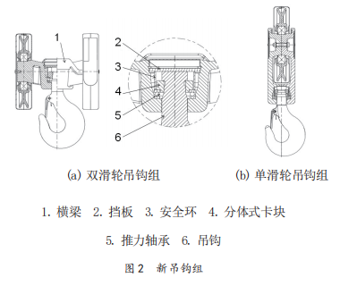新设计的吊钩组在总体结构、外形、材料、机加工及使用功能等多个方面进行了优化。总体结构详见图 2。对于双滑轮吊钩组,采用特殊设计的横梁,将传统的滑轮轴及吊钩横梁功能合二为一,减少了零部件数量,简化了装配工艺。另外该设计可以使用标准吊钩并实现最小的整体高度尺寸。使用分体式卡块替代螺纹连接,省去了吊钩螺母,改善应力集中,避免配做简化装配。设置钢丝绳保护装置并且在设计中尽可能的降低吊钩组重心,即保护了钢丝绳又能最大程度的避免空钩偏斜的问题。对于单滑轮吊钩组,将滑轮轴、拉板及吊钩横梁整合为一个零件,并且采用分体式结构,进一步简化了零件数量和装配流程??榧暗豕匙槲盗谢杓疲×客ㄓ茫跎倭苏鱿盗械牧悴考?。