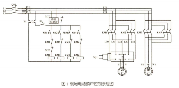 现场电动葫芦控制原理图如图1所示。电动葫芦起升高度限制完全取决于断火限位器SQ1,当电动葫芦上升时钢丝绳推动导绳器移动,当电动葫芦上升至设定高度时导绳器推动固定在导杆上的挡块带动导杆移动,使断火限位器QS1动作,断开电机上升电源的两相,使电动葫芦停止上升;当电动葫芦下降至设定高度时导绳器推动固定在导杆上的挡块带动导杆移动,使断火限位器QS1动作,断开电机下降电源的两相,使电动葫芦停止下降。根据电动葫芦控制原理分析可能造成电动葫芦冲顶事故的原因有以下几个方面: