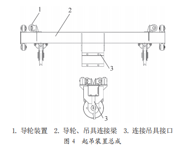 4)相较传统葫芦起升装置可不设置重锤限位。起吊装置总成上的水平轮装置在葫芦架矩形管导轨上运行,当径向水平轮装置运行至葫芦支座下矩形管处时,导向轮与葫芦架矩形管底面接触停止,防止冲顶,有效提高了起升上极限约 200 mm。