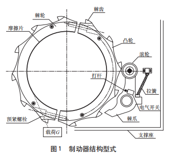 安全制动器结构型式如图 1 所示,当负载下降时,卷筒逆时针方向旋转,滚轮在凸轮的激励下带动摆臂做周期性摆动。当弹簧作拉力不足以克服摆臂摆动力时,摆动倾角逐渐加大直至带动棘爪与棘齿啮合,此时打杆触发电气开关,断开下降方向的控制回路,棘轮通过摩擦阻力实现减速制停。