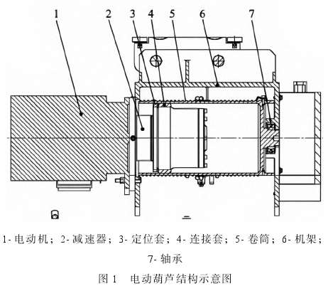 电动葫芦由多个结构部件组成,每个部件在设备的运行中都扮演着至关重要的角色。电动葫芦的基本组成包括电动机、减速器、卷筒、定位套、连接套、轴承、机架等(图 1)。减速器的功能是把电动机的高转速小转矩转换成低转速大转矩输出,以带动卷筒。钢丝绳缠绕在卷筒上,利用卷筒的转动完成负载的升降。定位套及连接套用来保证各零部件间的连接准确,避免出现传动误差或零部件松脱现象。