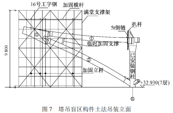 2、超重构件土法吊装:1 号塔吊 C6015 起重能力较小,而 CC 轴部分构件超重,因此需进行土法吊装。其中,对于超重钢柱,首先在其两侧搭设格构式胎架并在胎帽顶部设置 16 号工字钢( 工字钢与胎帽焊接牢固) 组成门字架,然后在工字钢中部挂设 5 t 倒链进行吊装; 对于超重钢屋盖主梁,采用在主梁两端已安装的钢柱牛腿上分别设置扒杆,然后在扒杆上挂设 5 t 倒链进行抬吊。格构式胎架采用 1 号塔吊 C6015 进行安拆及周转。