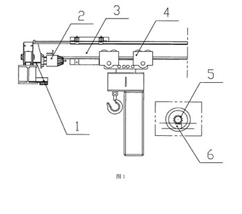 型结构,小车(4)为环链葫芦,挂于主梁下翼缘板上运行,并完成升降动作,葫芦运行为电动,停止手板固定。打车三合一装置(2)至于端梁一端,该装置由电机(自带制动器)减速器组成,减速器