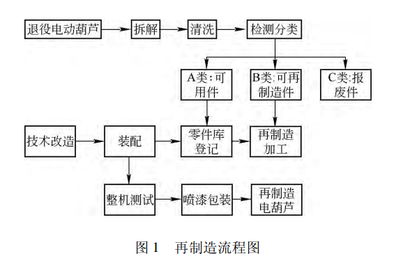 电动葫芦的再制造主要步骤包括回收和初步检查、拆解、清洗、检查分类、再制造加工、在装配以及整机测试,其流程如图1所示。