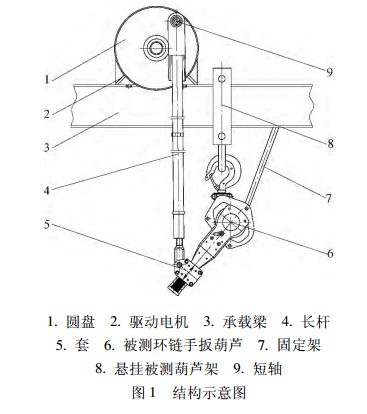 环链手扳葫芦需要悬挂在规定工位上,将驱动装置的电机以一定角度和一定距离固定在悬挂环链手扳葫芦的承载梁上, 角度要求电机输出轴与环链手扳葫芦的操作手柄相垂直, 距离要求安装完驱动装置后不发生干涉。在固定好驱动电机后,在电机输出轴上安装一个周边焊有小短轴的圆盘,在小短轴上通过关节轴承连接一根长杆(长杆可分为几段,相互通过螺纹扣连接,方便调节距离,关节轴承可以调整角度),在长杆的另一端通过螺纹扣连接一个套 (套可以灵活转动) ,通过该套与环链手扳葫芦的操作手柄进行连接,见图1进行试验时,首先接通电源,电机带动安装在输出轴上的圆盘做圆周运动,圆盘上的短轴带动长杆以电机输出轴为中心进行上下摆动,这样,环链手扳葫芦的手柄在长杆上连接套的带动下一起上下摆动,从而实现重物上升、下降的动作。为了避免在进行试验时环链手扳葫芦的转动,可以在承载环链手扳葫芦的梁上焊接一固定支架,通过支架将环链手扳葫芦的相对位置固定好, 从而实现更好,更有效的操作。