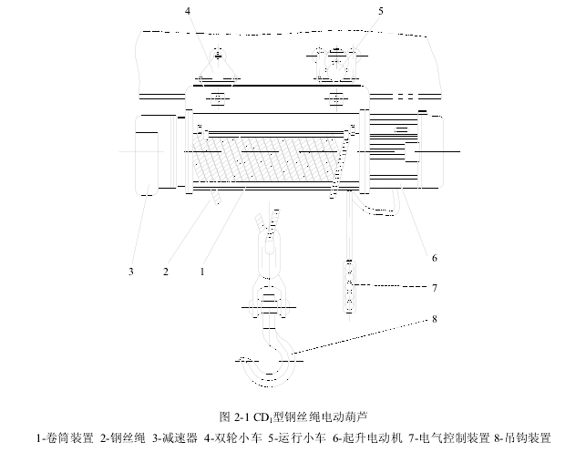 CD1型钢丝绳电动葫芦通电时,带锥形转子的起升电机,通过弹性联轴器,直接驱动减速器输入轴的齿轮轴,经过三级齿轮减速,由减速器输出轴的空心轴驱动卷筒转动,从而能将钢丝绳缠绕使吊钩作升、降动作,断电时,起升电动机的锥形转子起制动作用,电动葫芦遂停止工作。起升电动机和运行小车的启、停动作都由电气控制装置操纵。