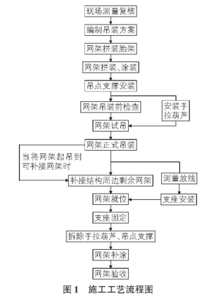 利用大起升高度手拉葫芦作为吊装起重设备。利用已完主体结构柱或梁作为手拉葫芦的系挂构件。在网架吊点下部加设下吊撑,采用低位吊装,可使网架的吊装高度超过手拉葫芦的系挂高度。将网架在主体结构范围内进行拼接组装,网架拼装的大小要能使网架顺利的通过主体结构,吊装到超过就位标高后补拼网架侧边网络构件,补拼后再进行网架就位固定。