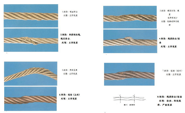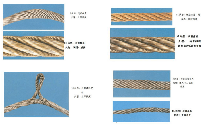 上面的图片可以清楚的看出哪些钢丝绳是需要报废的,哪些是需要减少起重量来进行起吊的。钢丝绳在上述所述立即报废的情况下,需要立即报废。否则会产生一些致命的危险。