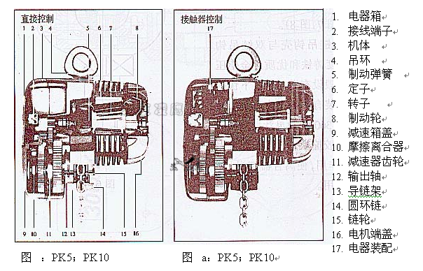 PK型环链电动葫芦减速机构采用二级(PK1、PK2)或三级外啮合直齿圆柱齿轮传动。齿轮和齿轮轴经热处理、表面强化处理,综合性能好。它们安装在密封式的减速箱体内,采用齿轮油润滑。在第二级传动齿轮上装有一个安全离合器(见下图),它由传动齿轮、摩擦环(片)、碟形弹簧以及中压板和调速螺母等组成。通过调整螺母可调整安全离合器内的摩擦力矩,使葫芦在额载时能正常运转,并在超载至极限时出现卡链或吊钩运行极限位置时,摩擦面产生滑动,对葫芦机构起保护作用。